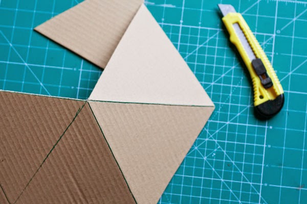 No los cortéis todos. Cortad solo por las líneas exteriores. En las líneas interiores, las que hay entre los triángulos, realizaremos un corte superficial, que solo atraviese la primera capa de cartón y deje la segunda intacta.