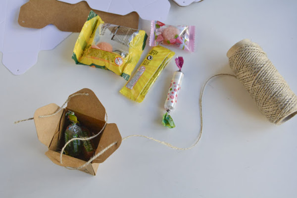 Ya sólo nos queda ir rellenando las cajitas con algunas gominolas o sorpresitas que nos gusten y cerrarlas con un cordón o lazo. Lo vamos a dejar bastante largo para que luego nos sirva para atarlo al palo.