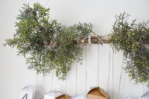 Colgamos nuestro palo de la pared y vamos atando las cajitas en orden aleatorio para que queden desordenadas y sea más divertido buscarlas luego. Si no os es fácil encontrar un palo natural, siempre podéis comprar una vara de madera que venden en cualquier tienda de manualidades y cortarla a la medida que necesitéis.