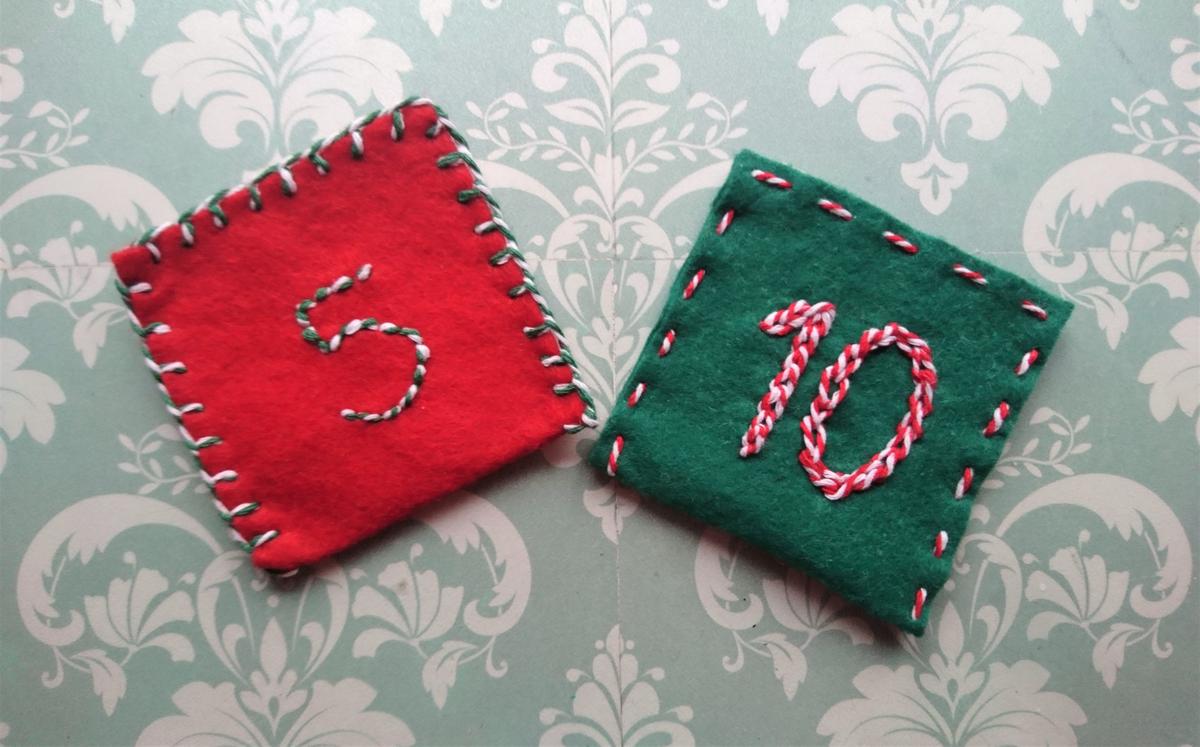 Ahora toca dar forma a los sobrecitos. Hice 24, 12 rojos y 12 verdes, para ir alternando y utilicé distintos tipos de puntadas para que fueran diferentes. Tienen una medida de 8 cm de lado.