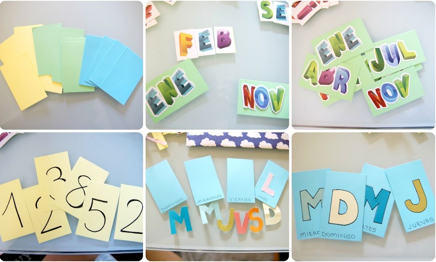 ♥ El siguiente paso esencial sería cortar las tarjetitas de cartulina en las que escribiremos los días del mes, los meses y los días de la semana. Yo hice para cada una de las categorías tarjetitas de un color, de unos 3,5x5,8 cm. En total corté 4 azules para los días de la semana (ya que los marqué tanto por delante como por detrás), 6 verdes para los meses del año, y lo mejor de todo también 6 amarillos para los días del mes (por supuesto podeís hacer los 31... pero en mi opinión, cuantos menos papelitos acabemos enganchando de las pinzas... mejor! ). Ya que si hacemos las combinaciones bien, con esos nos sobra para poder marcar todos los días del mes. Para esto, las combinaciones de parte delantera y trasera de la tarjetita que yo hice son: 1-3; 0-2, 6-1; 7-8; 9-2; 4-5.