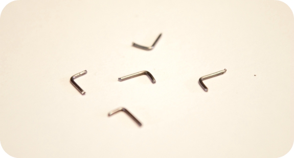 Para hacer los enganches donde colgaremos nuestras fichas, cogemos el clip y con el alicate cortamos un trozo y le damos forma de L, tal y como te muestro en la siguiente foto.