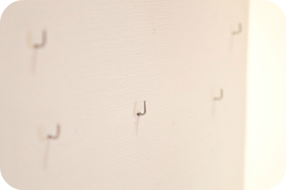 Con la chincheta y el alicate hacemos los agujeros en la madera para poder colocar las escarpias que hice con el clip. Una vez hecho cogemos cada una y con un poco de cola blanca u otro pegamento las metemos cada una en un agujero.