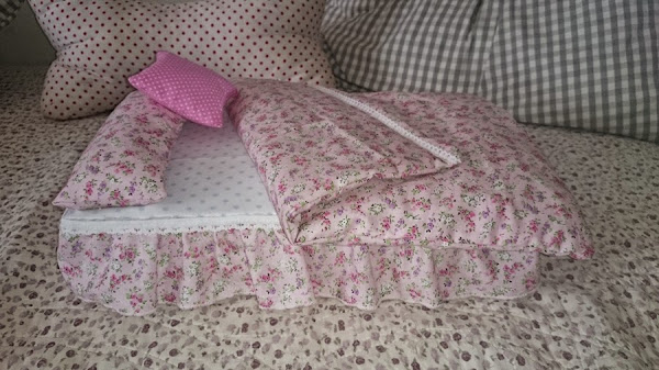 7- Cosemos la ropa de cama que yo también pegué a la cama. (conozco a mi hija y como no tengo muchas ganas de coser una almohada cada semana y un edredón cada tres días....todo bien pegadito. Eso sí, con sitio para la señorita para dormir....