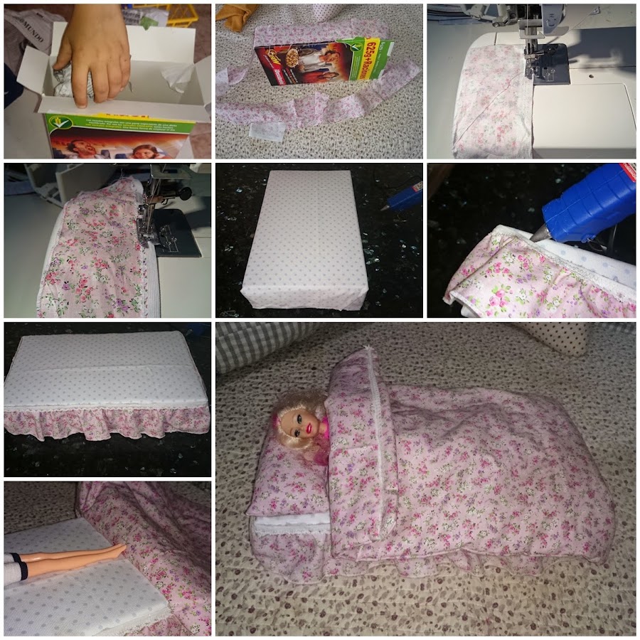 2- El coste, con telas que tenía por aquí y por allí, con una caja vacía de cereales, con pegamente y poco mas.... Un coste bajísimo comparado por lo que nos cobran con lo que cuestan los artículos originales de Barbie....y sin ánimo de ofender, mi cama es diviiiiiina
