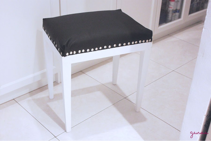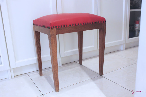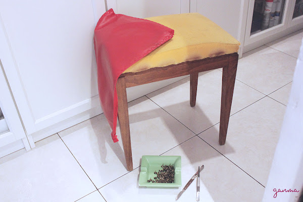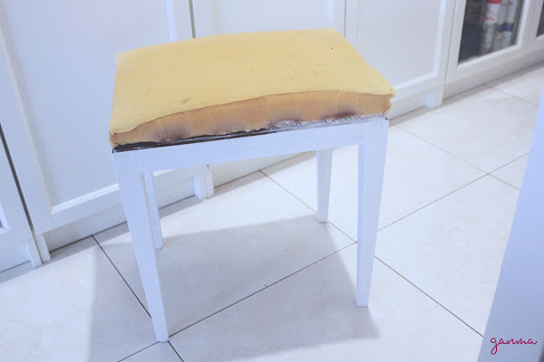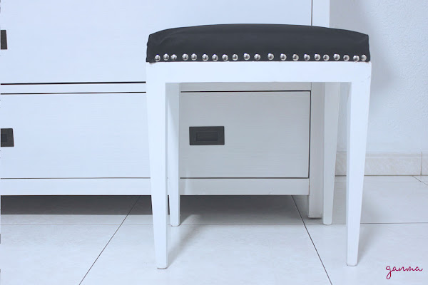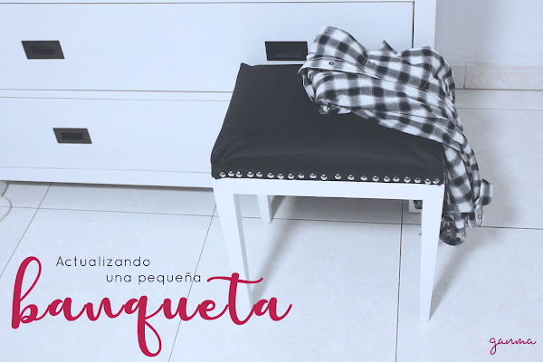 Al fin, la otra tarde me decidí a coger el bote de pintura y revisar los restos de tela que hay por casa para darle un cambio de imagen a esta banqueta tan práctica.