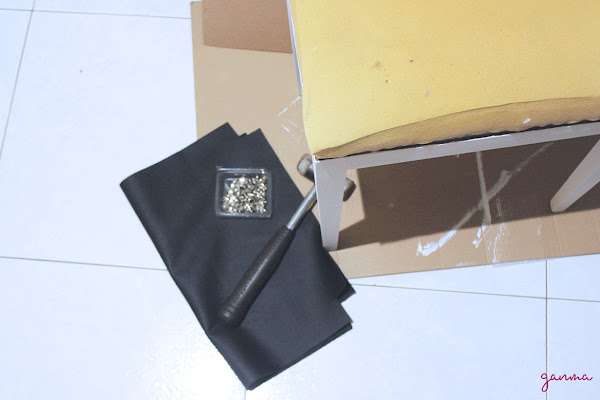 Como siempre lo primero es quitar la tela vieja para poder pintar bien toda la madera. Ya sabes que suelo pintar mis muebles con pintura de pared que da muy buen resultado.