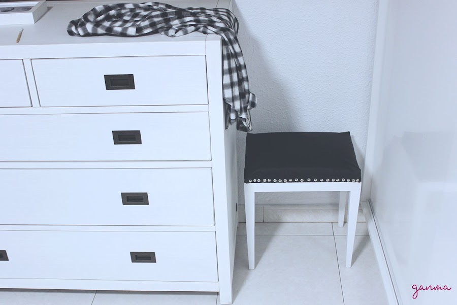 Desde que nos mudamos al piso tenemos esta banqueta en el dormitorio y es donde va la ropa del día a día cuando te pones el pijama.