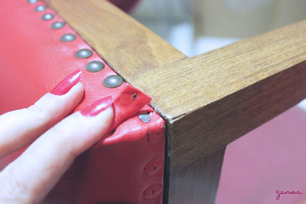 Compré chinchetas nuevas, las viejas se habían quedado en color dorado viejo y yo las quería plateadas. Poco a poco, con el martillo, unas pinzas y mucha mucha paciencia chincheta a chincheta y alternando los lados quedaron las chinchetas colocadas.