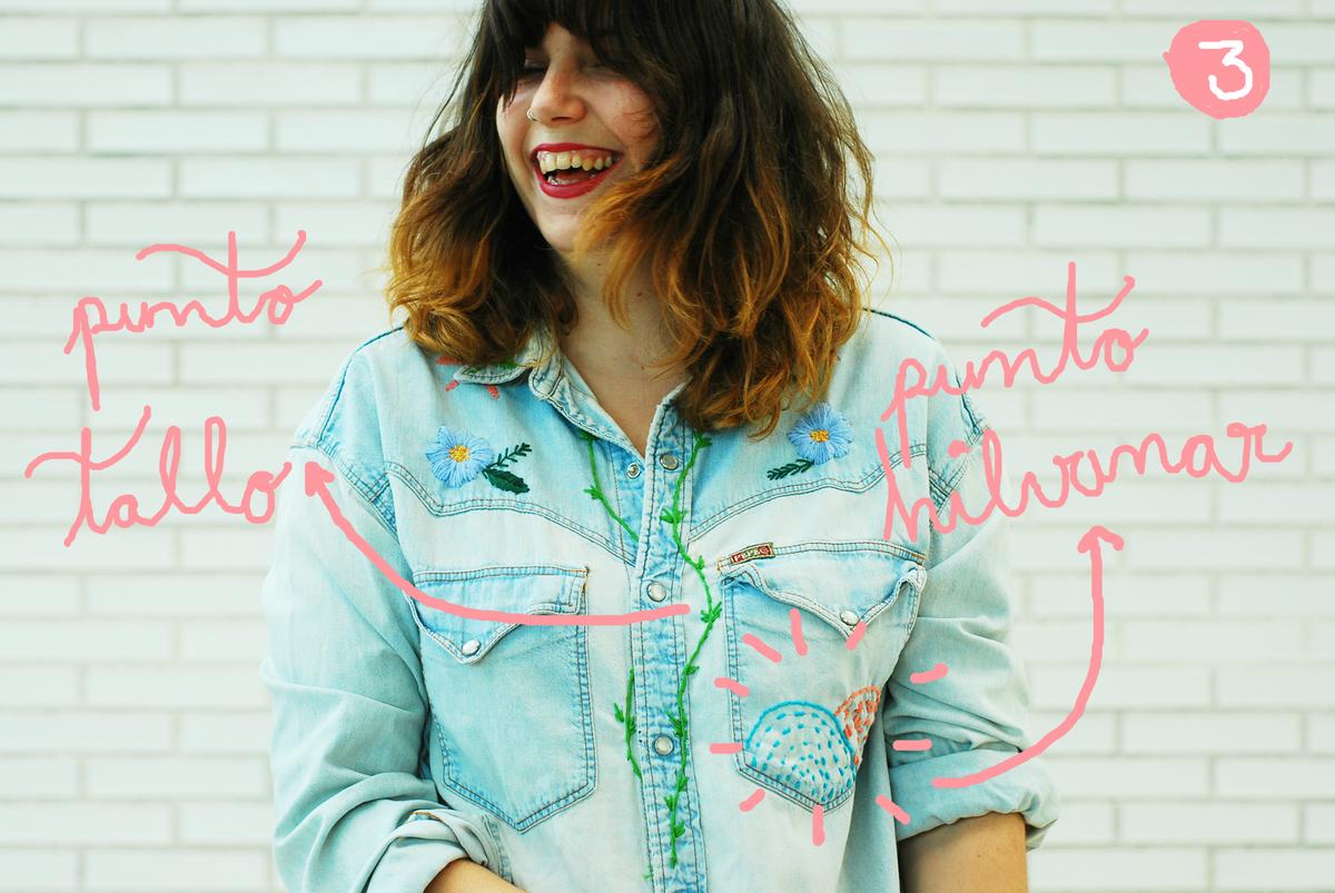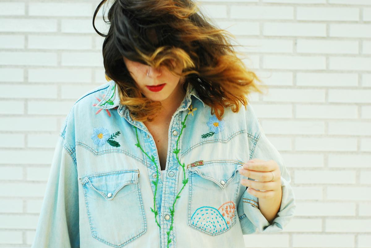 Esto es lo que hice yo, ir probando cosas que me gustaban, usando diferentes tipos de hilo y colores. Para esta camisa he usado hilo DMC para bordar, algodón finito, lana más fina y más gruesa dependiendo los colores que quisiera usar y el volumen que le quisiera dar.