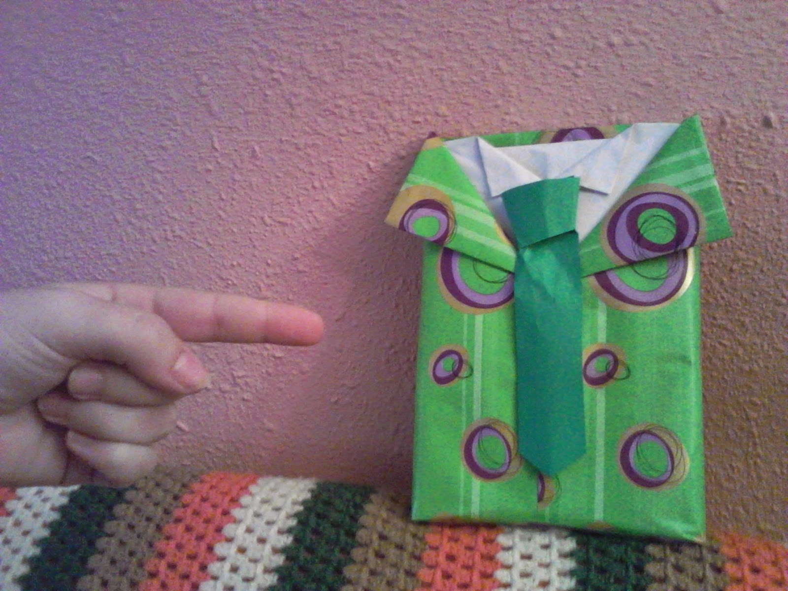 Tan sólo con papel de regalo y unos trocitos de folios de colores, tenemos esta envoltura en forma de camisa, con su corbata y todo :)