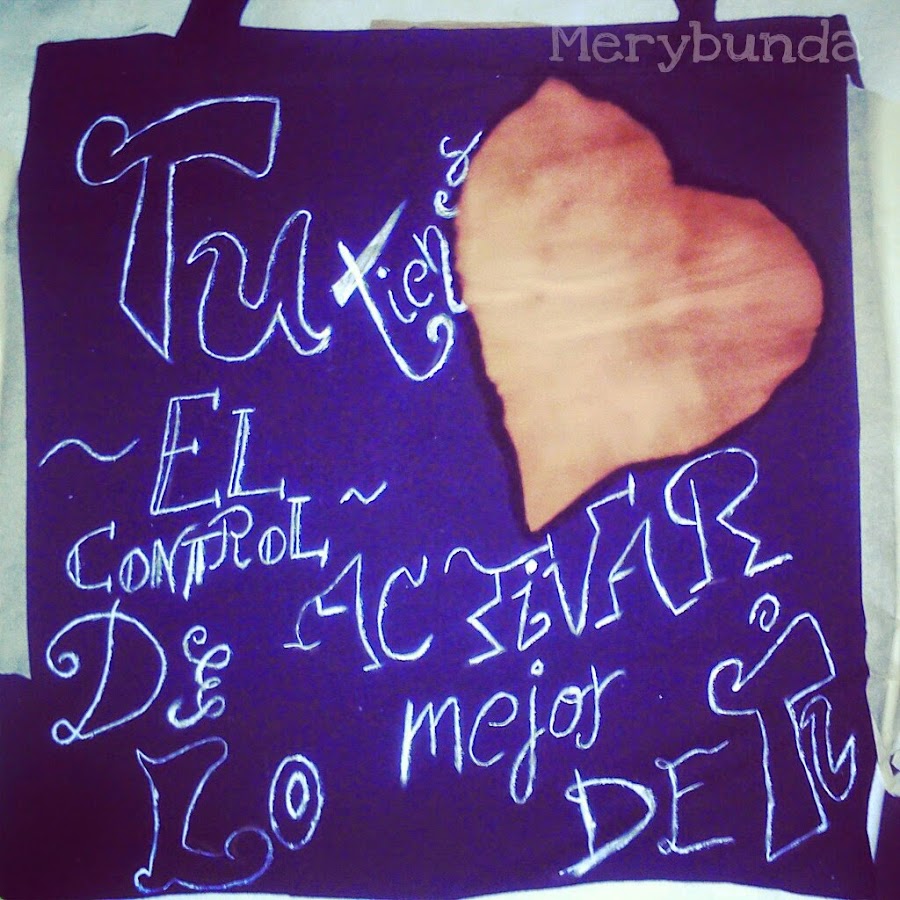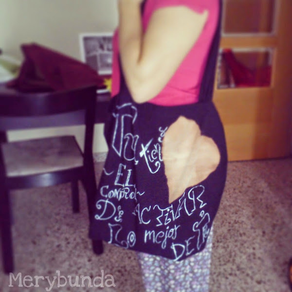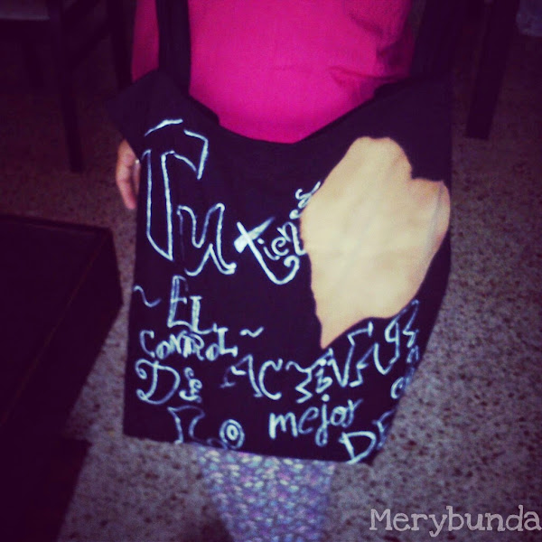 6. Un poco de lejía, pintura de tela, una frase ingeniosa y positiva (No olvidemos que esta bolsa está hecha porque yo éste verano estoy más gorda que una cebolla) y una super bolsa multiusos.