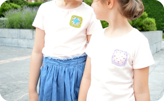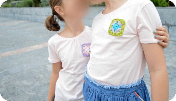 Quería probarlo haciéndoles unas camisetas a las niñas, por eso el granny solo tiene tres vueltas para que quede pequeñito, pero nos ha gustado tanto el resultado visto en persona a mi hermana y a mi, que ya estoy haciendo otros dos mas grandes para nosotras jejejeje