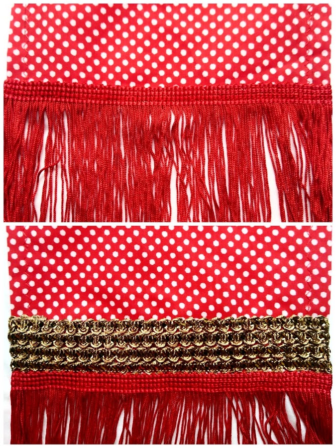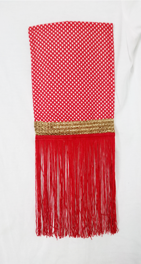 Una vez cosido el dobladillo de arriba, colocamos el bolso en el lado y altura que más nos guste y lo fijamos con alfileres y con cuidado, cosemos a la vez el dobladillo y el bolsillo a la camiseta, todo junto. Cosido todo en su lugar, pasamos a dar un toque especial a la camiseta añadiendo unos flecos y una cinta dorada al bolsillo, esto al ser más delicado de coser, lo uní a mano.