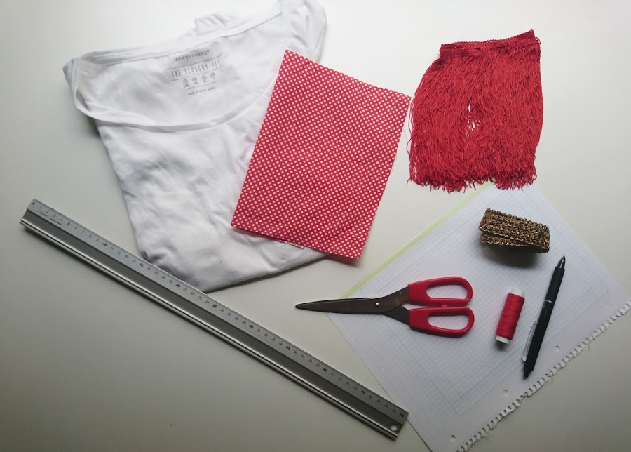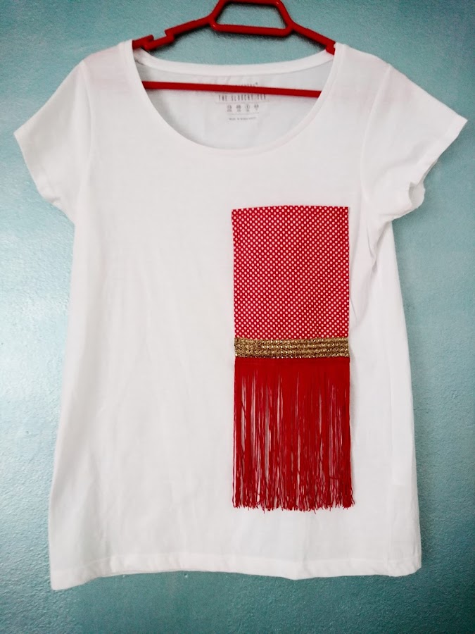 Con todo esto, ya tendríamos lista nuestra camiseta. En el caso que sólo tuvierais una camiseta estampada, podríais usar tela lisa para dar forma al bolsillo y así evitas que de aspecto de sobrecargada. También podéis utilizar volantes en lugar de flecos y adornar los tres lados que cosemos a la camiseta.