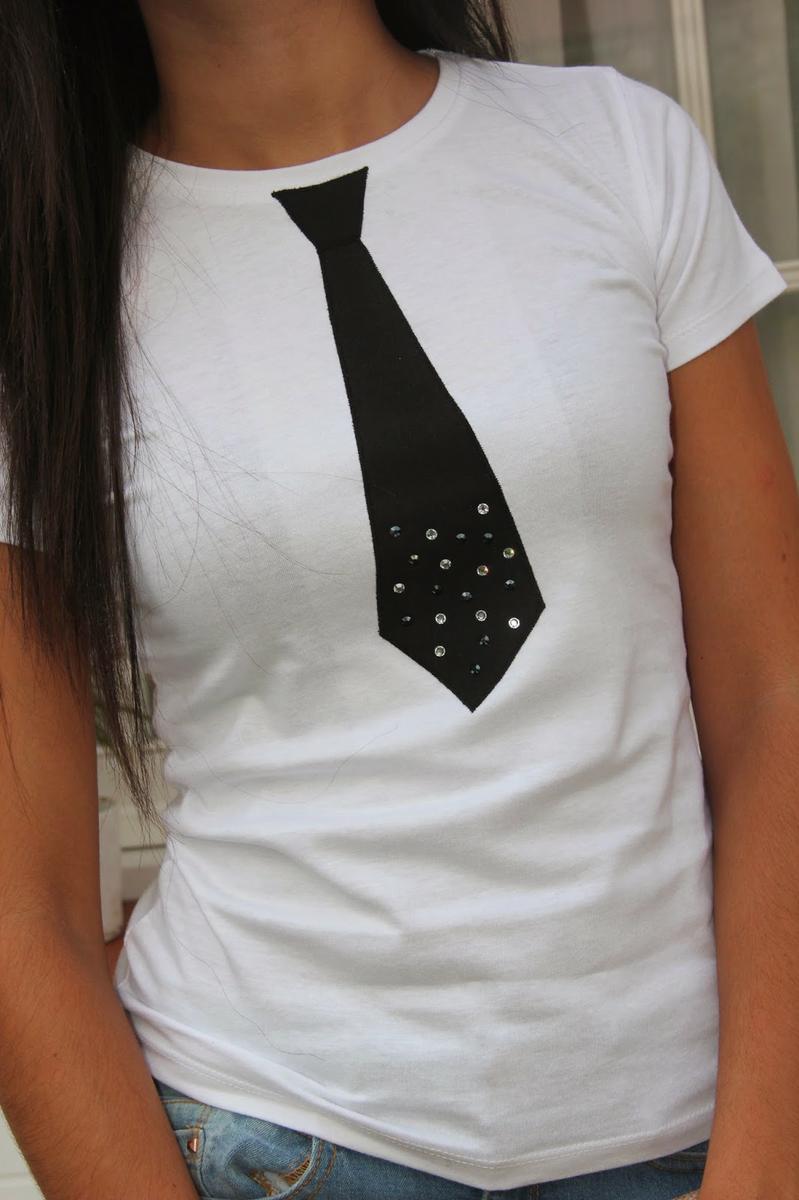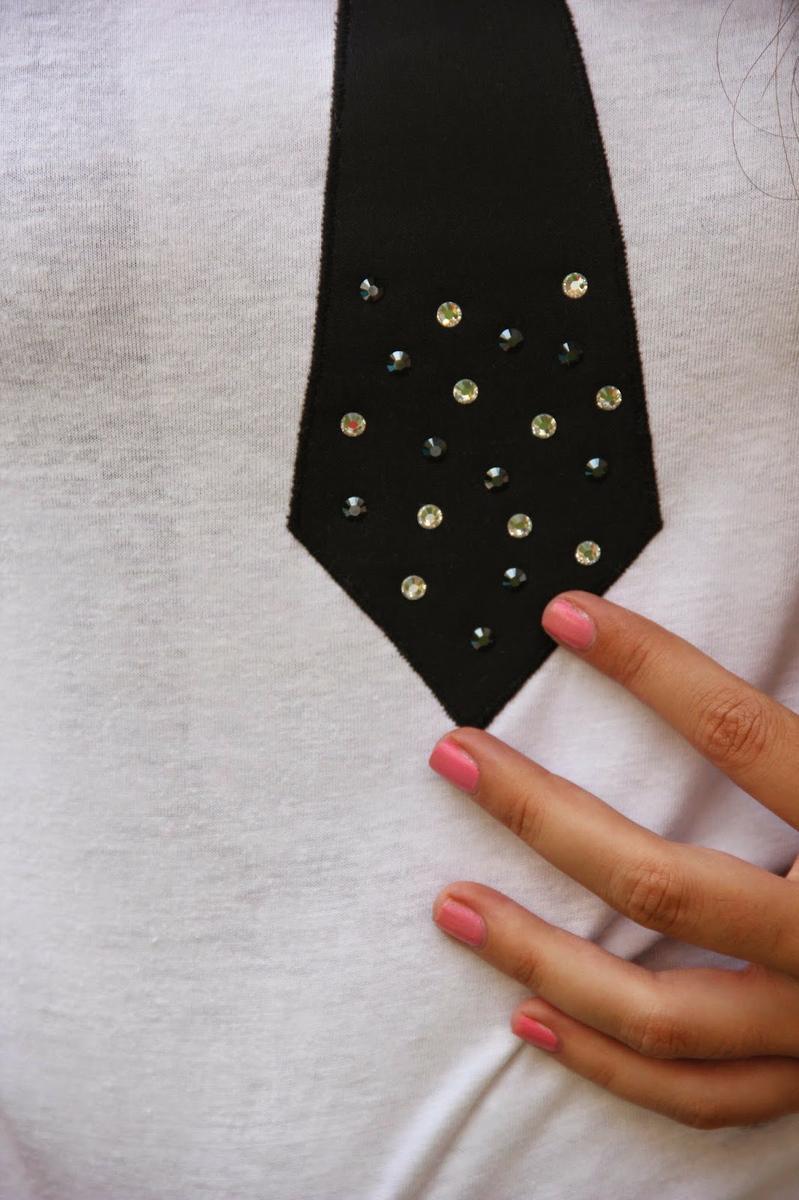 Hoy os traigo una idea genial para personalizar una camiseta, aplicando una corbata y adornándola con cristales de strass, para darle un aire más femenino. No me digáis que no queda bien y nos puede servir tanto para ir al trabajo como para salir de fiesta. Queda bien de cualquier manera.
