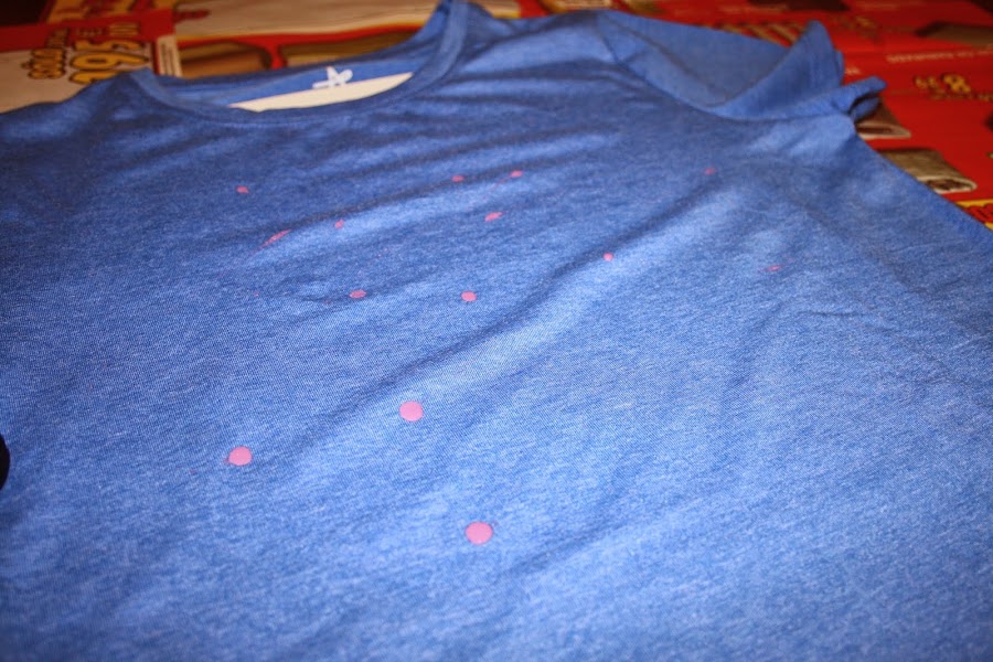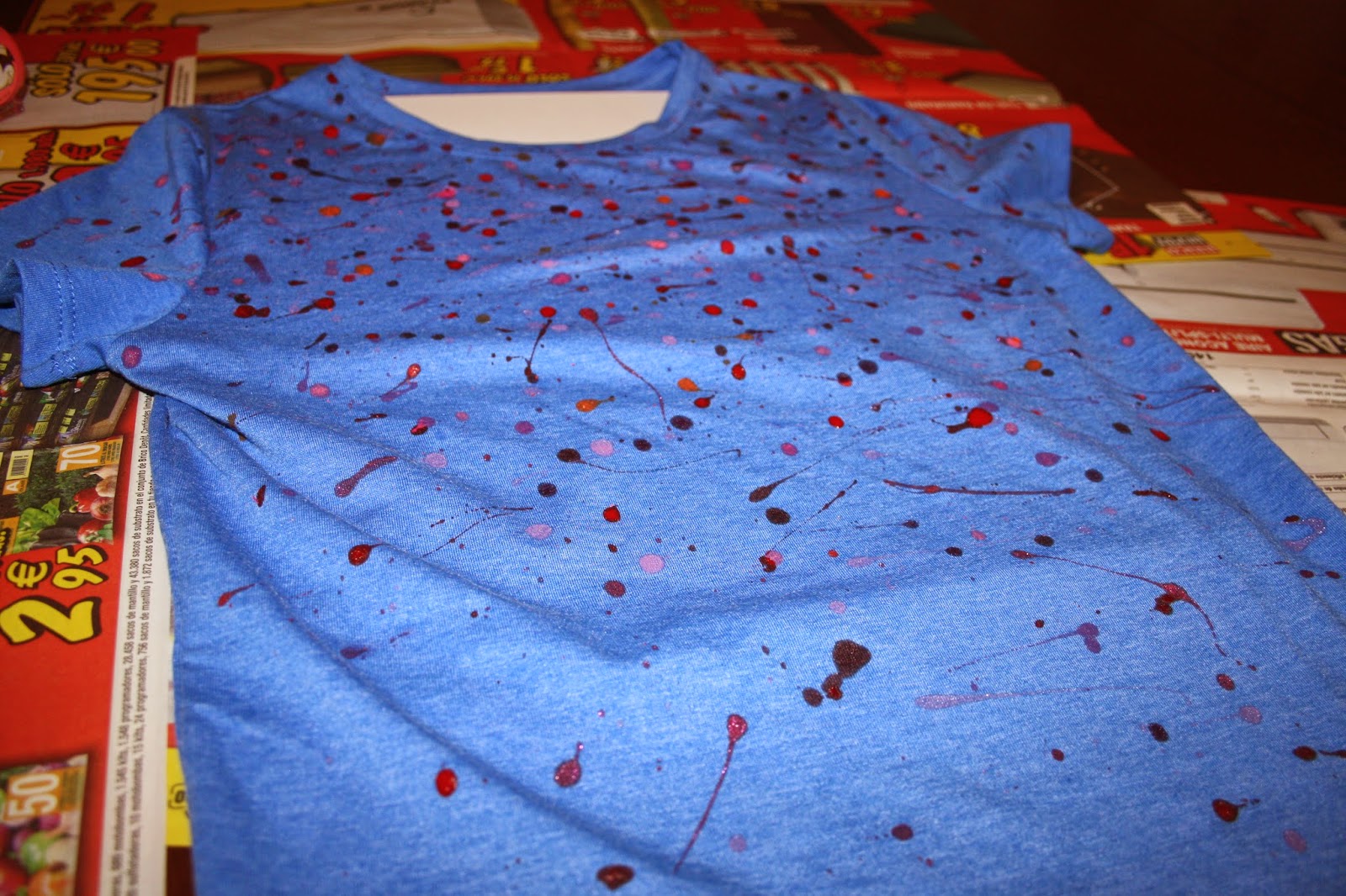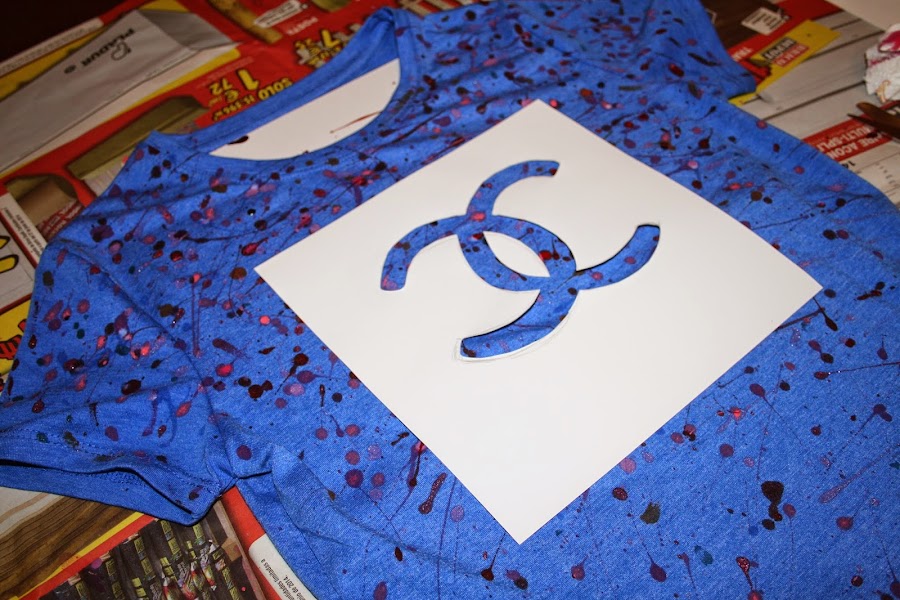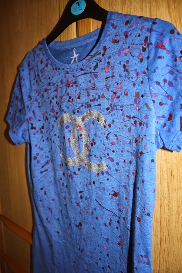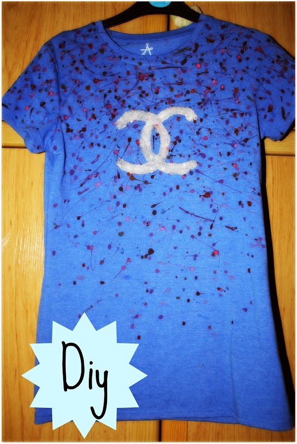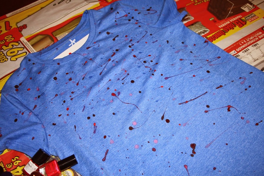 Solo necesitamos una camiseta básica que queramos "destrozar" (la mía la compré en Primark por 2 â?¬), esmaltes de uñas de colores, papel, lapiz y tijeras.