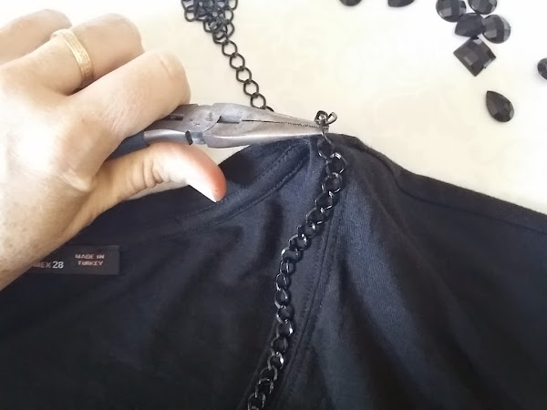 Pasamos a coser la cadena en el hombro y seguimos toda la manga como hasta ahora hasta llegar al primer eslabón cosido separando con las tenazas los eslabones que sobran y cerrando la última con la primera o cosiendo las dos unidas como prefieras. Y lo mismo con la otra manga.