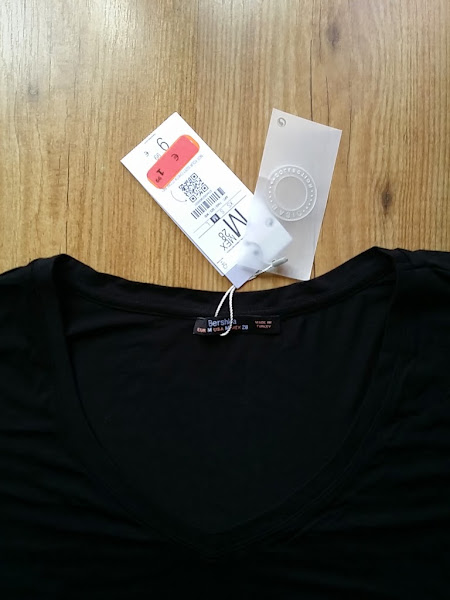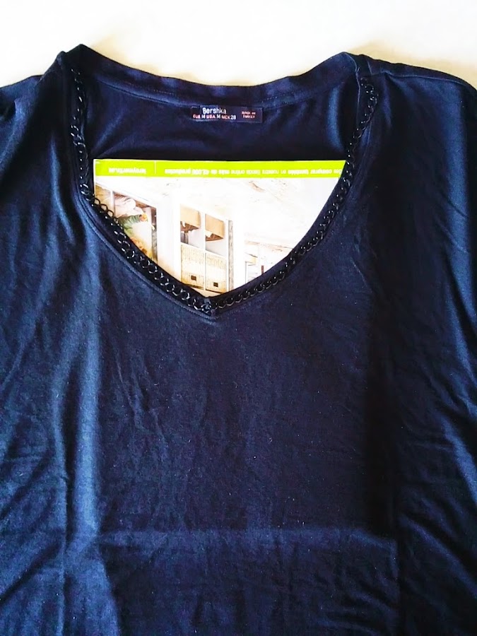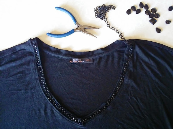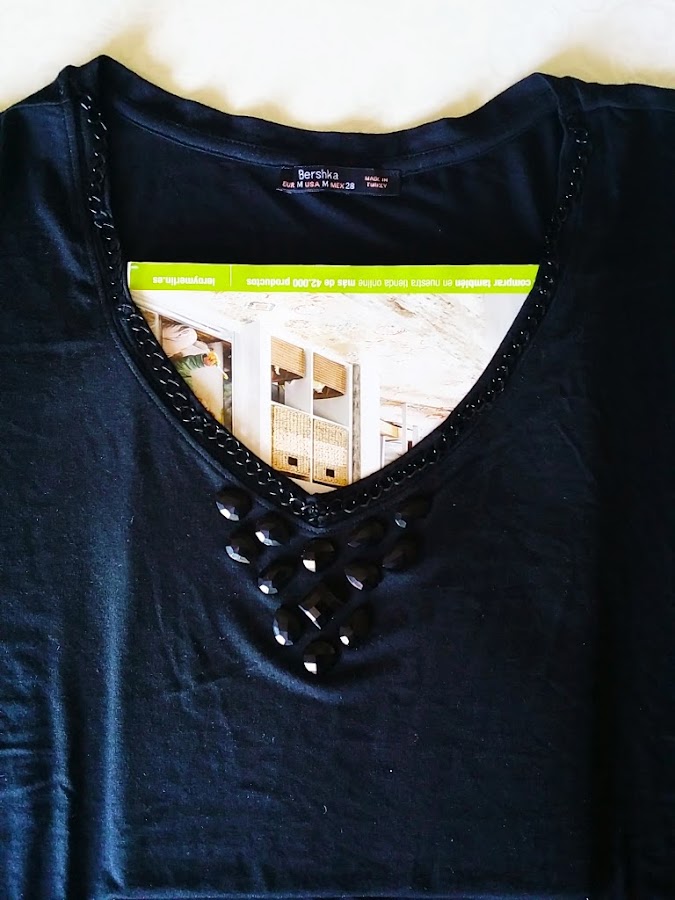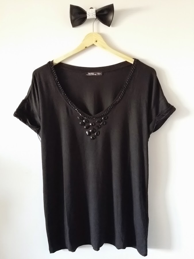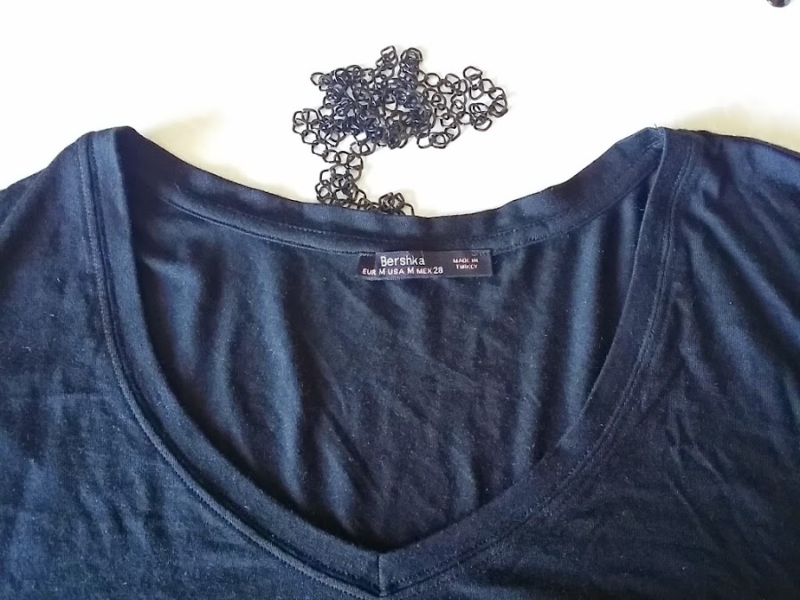 Una de ellas es esta camiseta de algodón básica negra de Bershka, me costó 1,99 ??? cuando antes valía 9,99 ??? que barbaridad de rebaja, tiene un dobladillo decorativo en las mangas y cuello de pico lo que me hizo pensar en hacer un efecto collar joya que pareciese que llevo un collar encima de la camiseta con la misma forma del cuello.