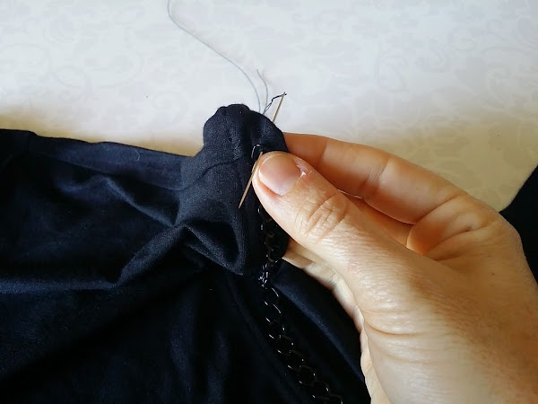 Desde el hombro al pico del cuello hacemos dos puntadas en diferentes zonas para que la cadena coja la forma del cuello,luego cosemos el pico del cuello ,seguimos la trayectoria ,dos puntadas más en diferentes zonas y la última en el pliegue final donde está justo la costura del hombro.