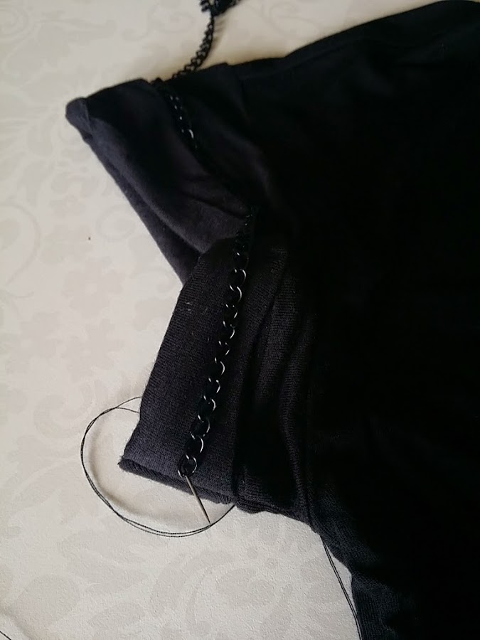 He utilizado cadenas de dos tamaños diferentes puesto que con una no tenía suficiente para el cuello y las mangas y decidí usar la más gruesa para el cuello y la más fina para las mangas.