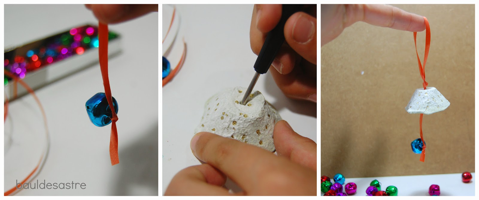 Se trata de unos adornos para el árbol elaborados con cartón de huevos y cascabeles.
