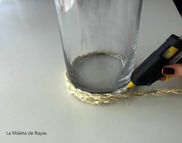 Vamos forrando toda la parte de abajo hasta la altura que queramos y si quedamos sin trenza y tenemos que empalmar otra, hacemos lo mismo de antes: primero silicona y cuando seque, cortamos y pegamos al jarrón.