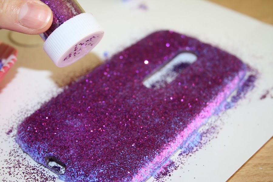 Lo primero que hacemos es limpiar bien la superficie de nuestra carcasa. Después hacemos la mezcla de pegamento y purpurina a partes iguales.