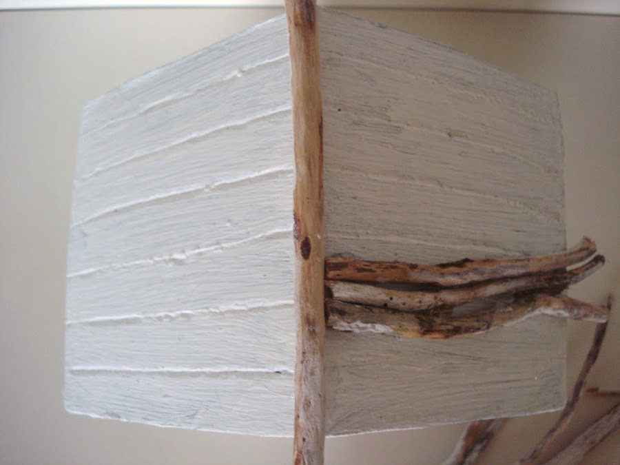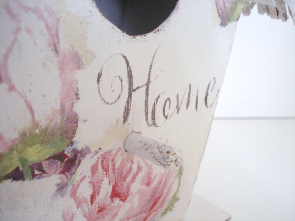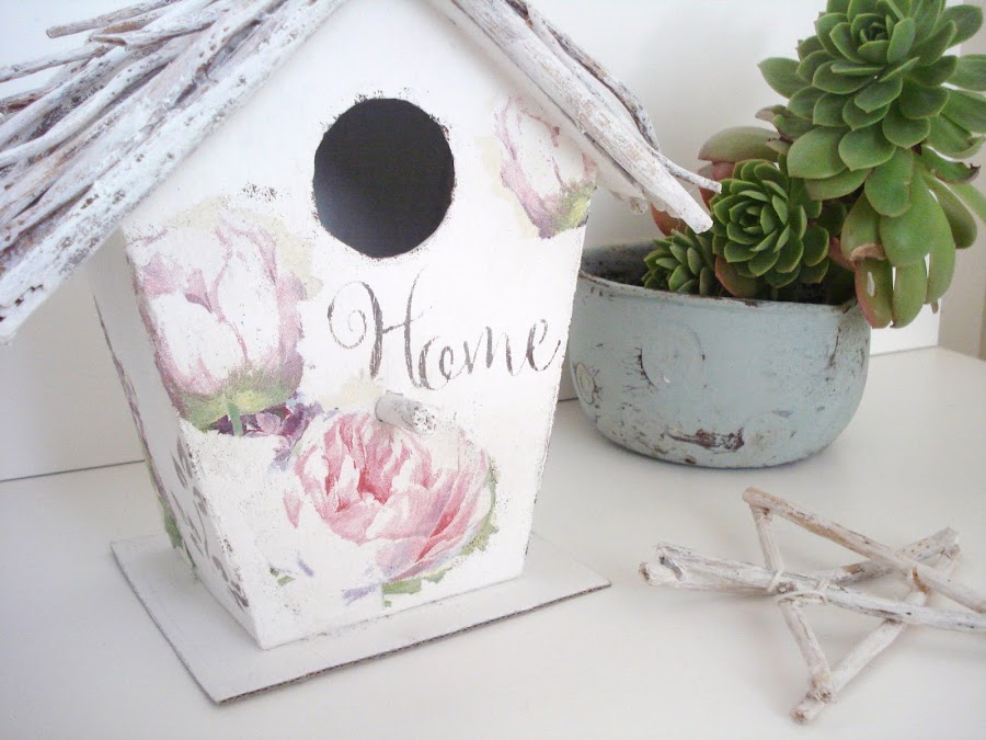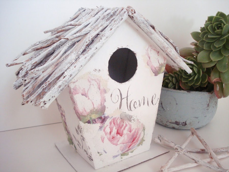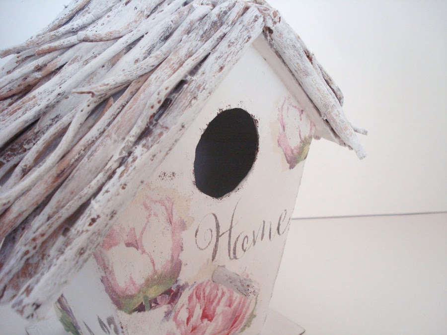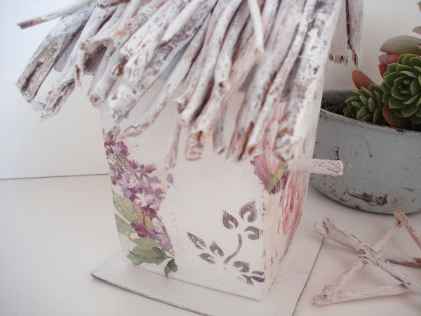 Para decorarla palos para el tejado, decoupage y unos estarcidos.