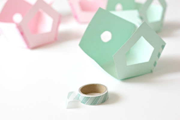A continuación unimos las caras de la casita utilizando washitape de colores y reservamos. En mi caso he utilizado del mismo color que las cartulinas pero se pueden emplear estampados diferentes si queréis algo más colorido.
