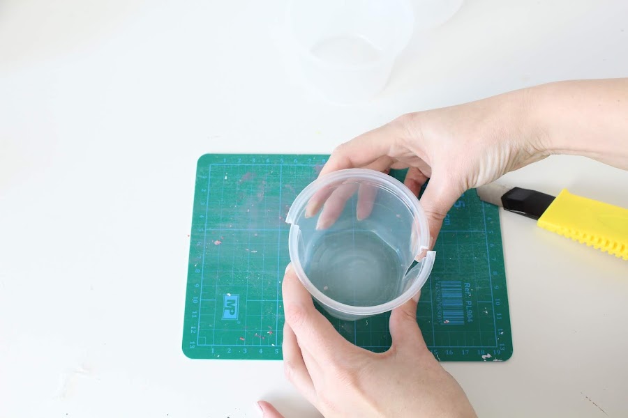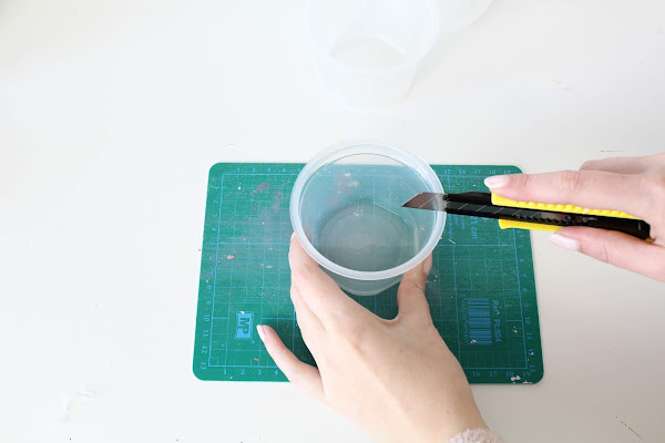 1 PASO: Cortamos el envase en horizontal, dos cortes para poder poner el aro. Taparemos bien con cinta el corte.
