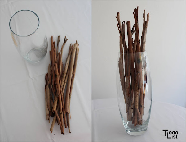 He hecho dos centros, el primero es tan sencillo como meter cortezas de árbol de distintos tamaños en un jarrón alto.