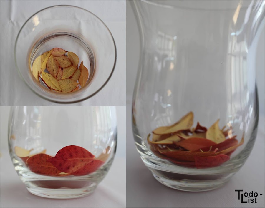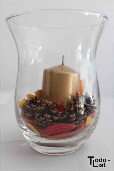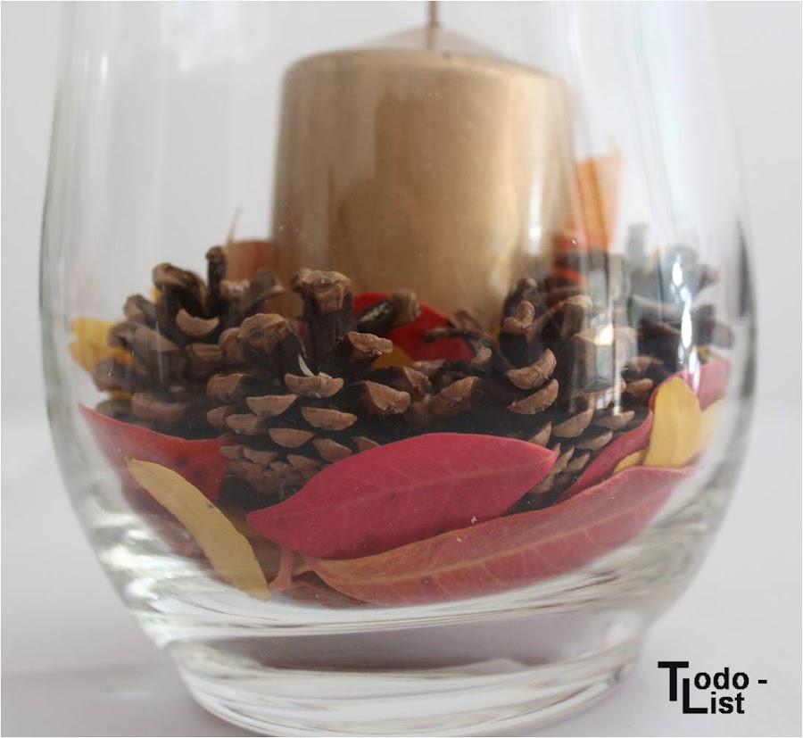 Ya solo nos queda colocar la vela en el centro del jarrón, sujetarla con unas piñas alrededor y añadir unas hojitas amarillas entre medias.