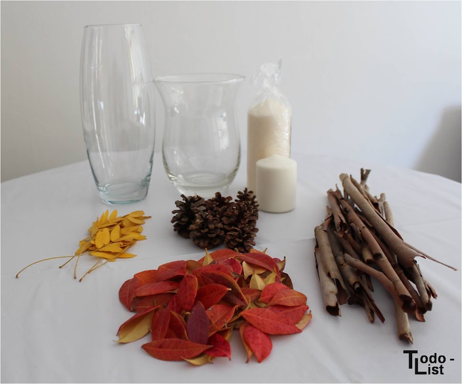 Para este DIY tan solo necesitáis 2 jarrones, hojas, unas piñas y unas cortezas de árbol.