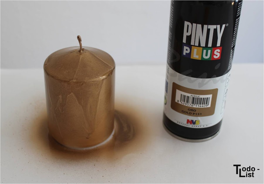 Con pintura en spray dorada pinte una vela. Tenía 2 opciones de vela pero al final descarté la mas alta.