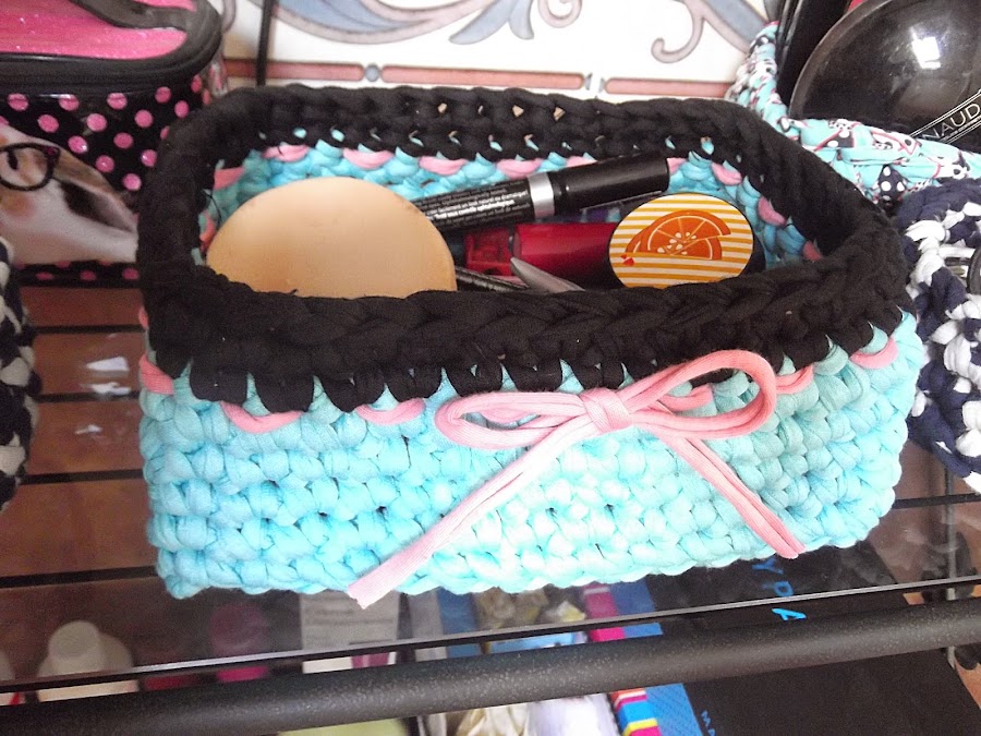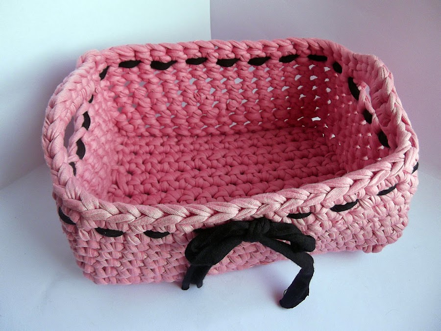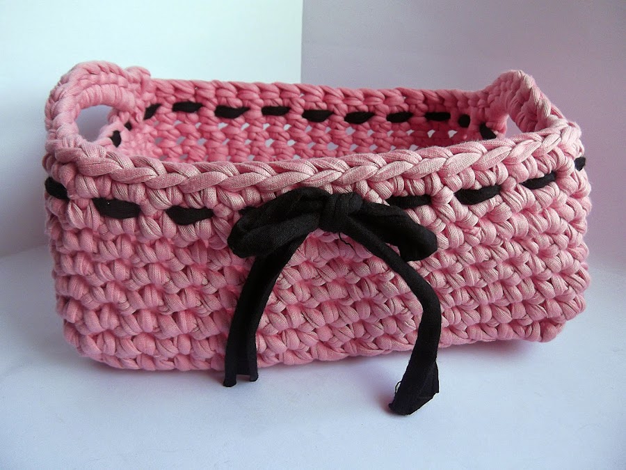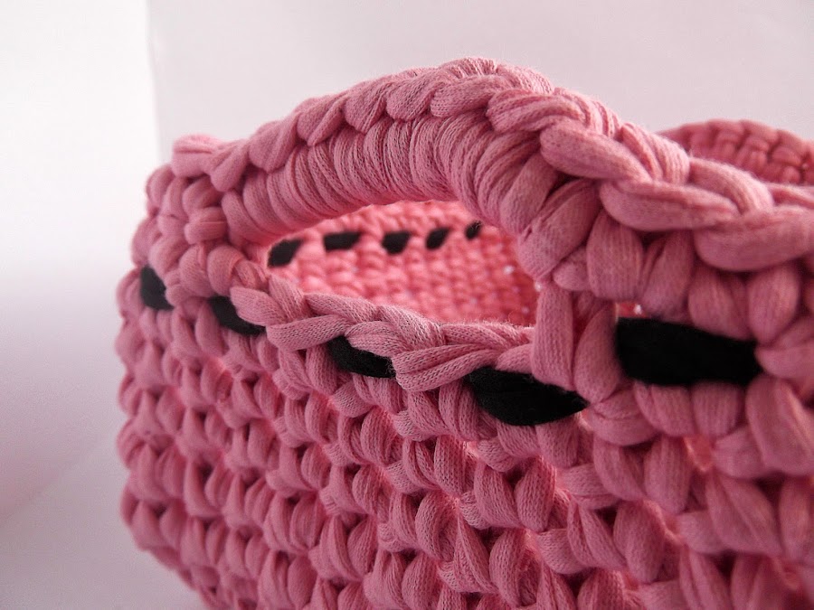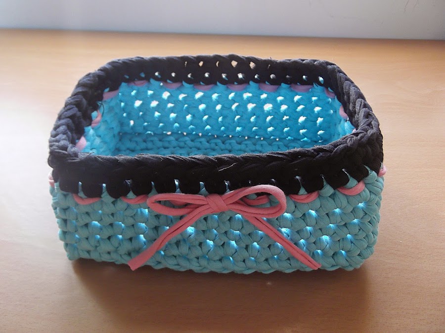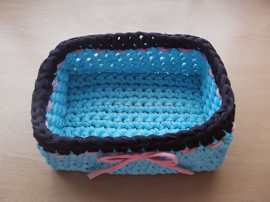 He utilizado trapillo de 3 colores diferentes, azul celeste para la base y las paredes de la cesta, negro para marcar el borde y rosa para el detalle de la cinta y el lazo; todos ellos comprados online en Mercería Sarabia.