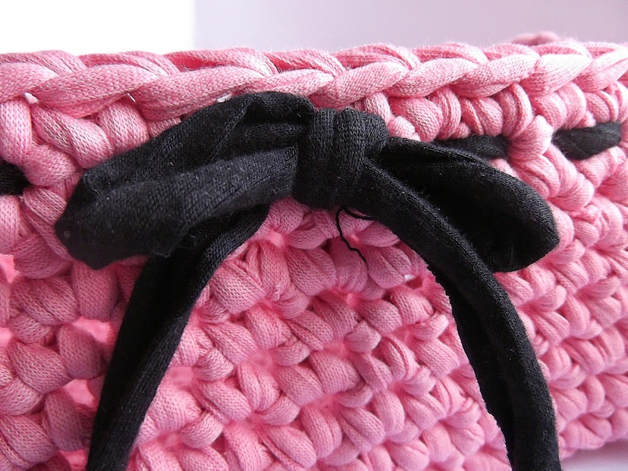 Aquí os dejo otro modelo, esta vez bicolor y con asas. He utilizado rosa como color principal y negro para el detalle de la cinta y el lazo. Esta va para mi hermana :)