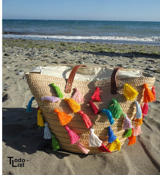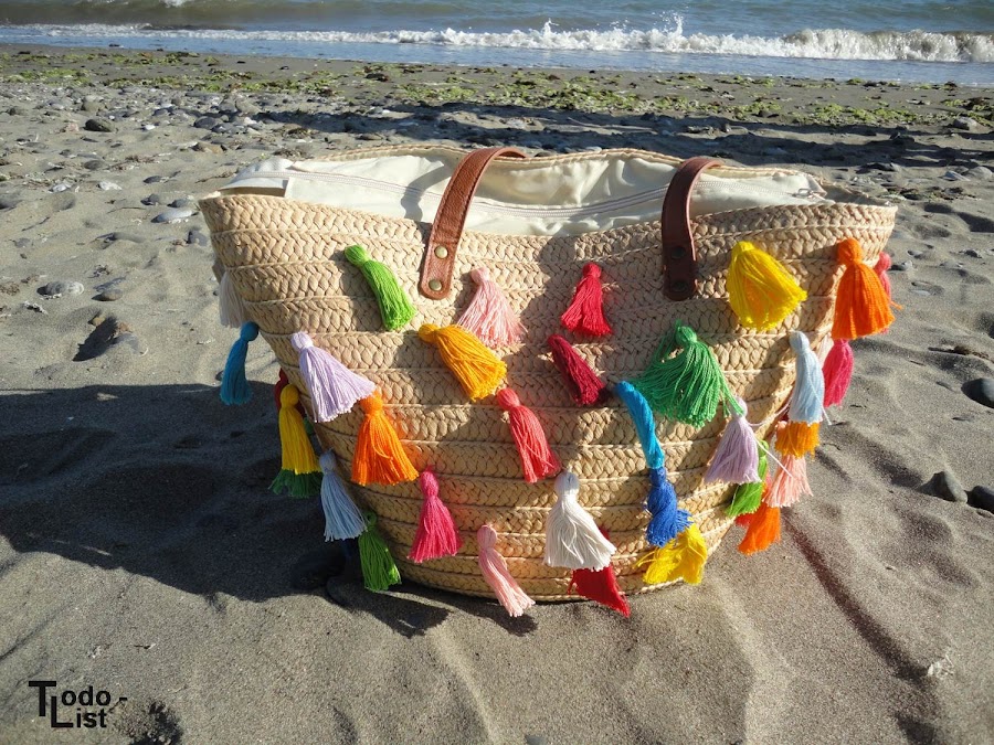 Como veis he usado la típica cesta de playa de Primark y parece otra después de añadirle las borlas :)