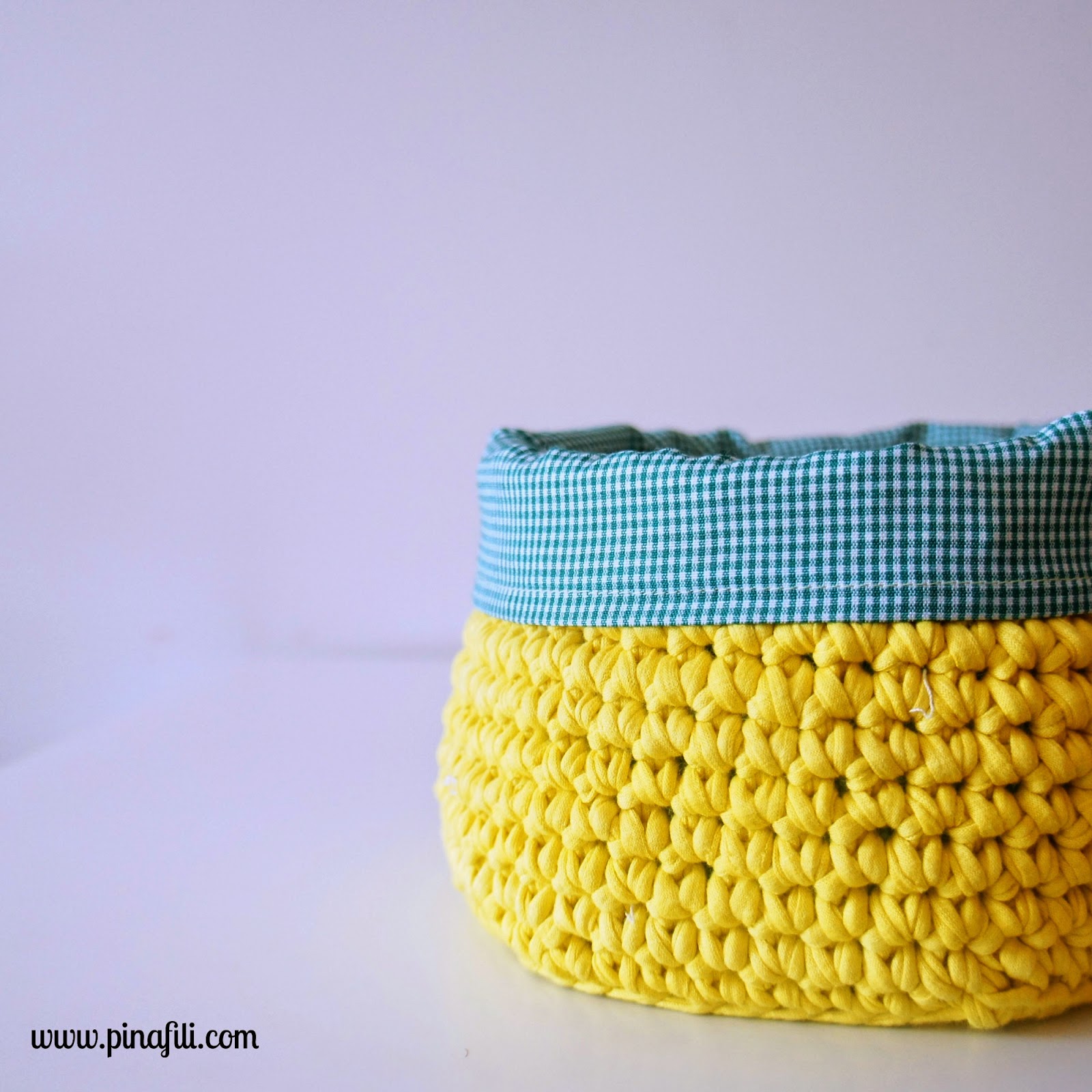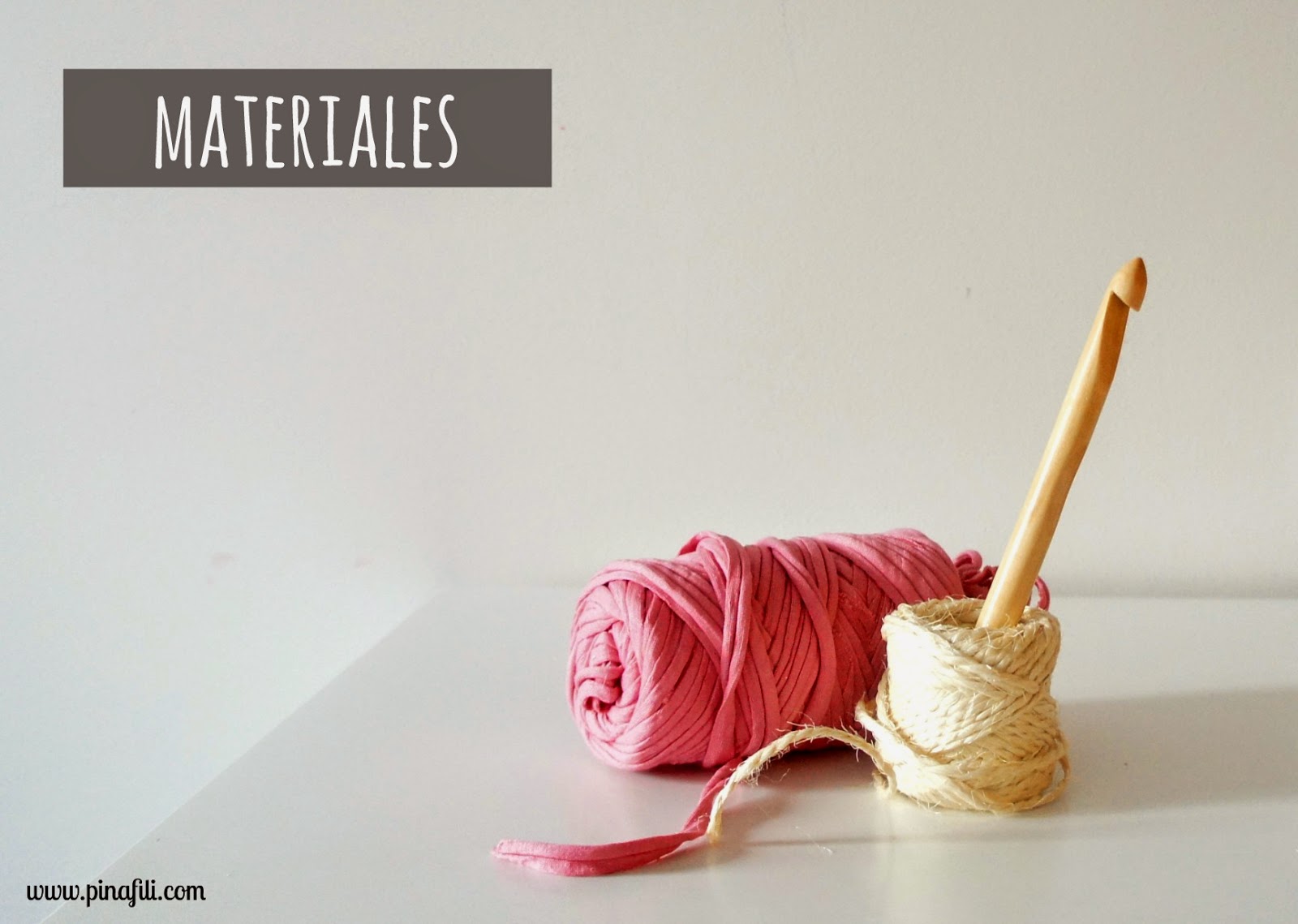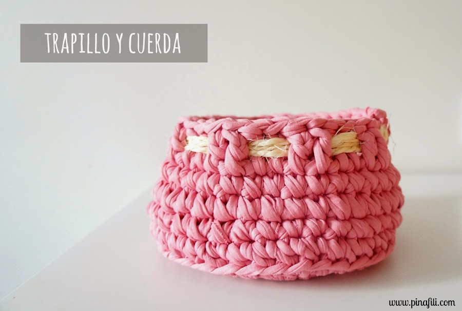 Yo lo he mezclado con cuerda, me gusta la mezcla de colores y textura, pero las opciones son muchas: tela, cintas, lazos, trapillo... En este cesto fui pasando la cuerda por grupos de dos puntos altos. Dos puntos altos por delante de la cuerda y dos puntos altos por detrás.