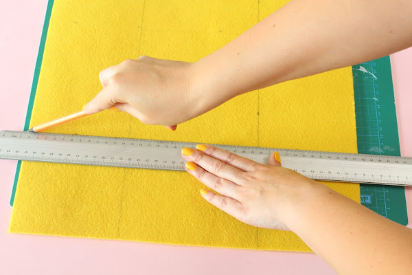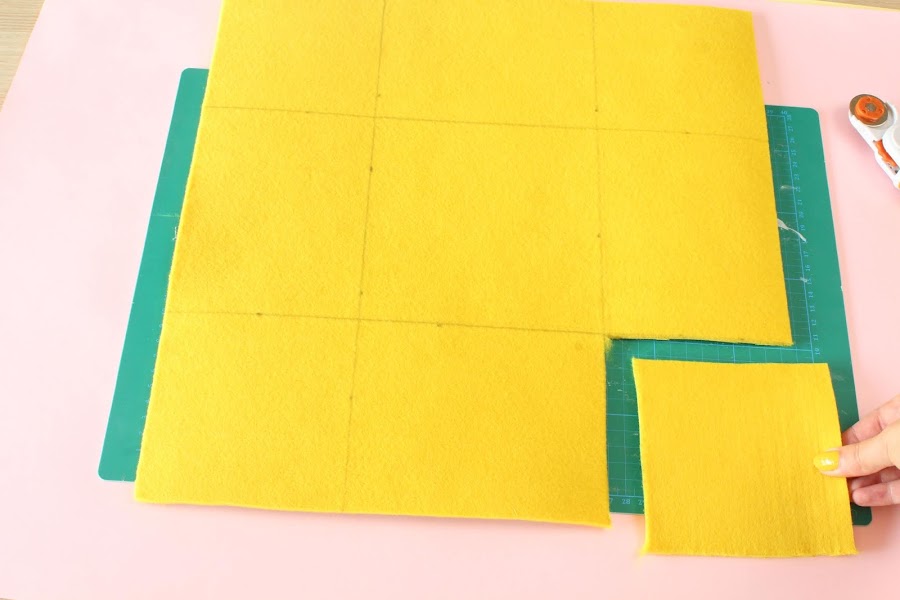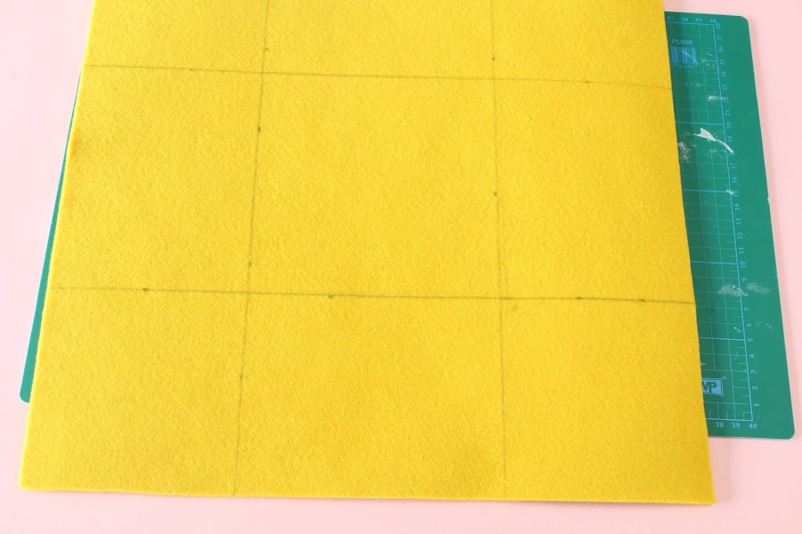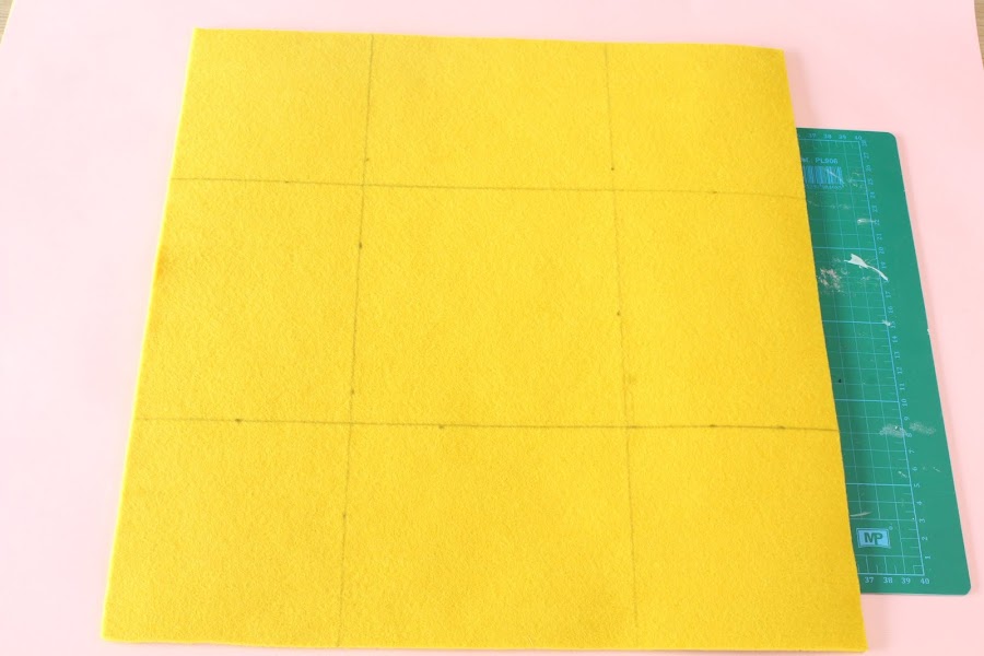 1 Paso: Mancaremos en el Fieltro la estructura de nuestro Cesto, una cuadricula de tres cuadrados por tres.