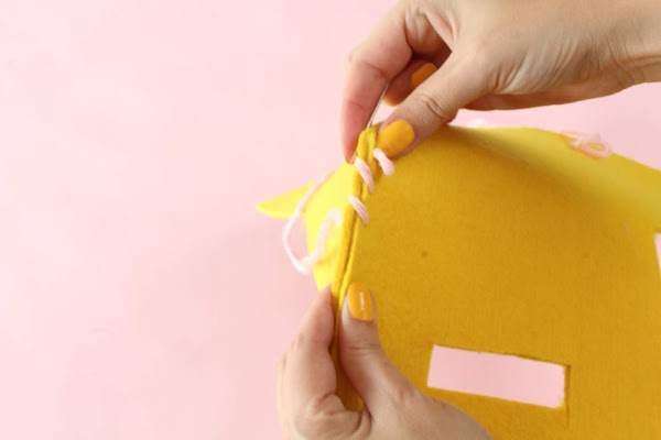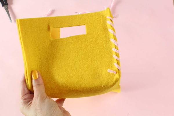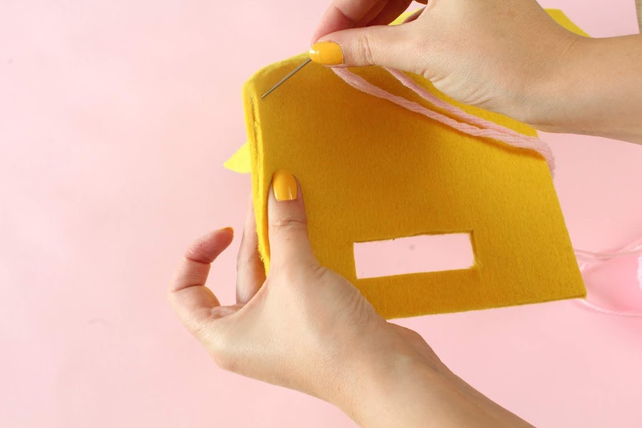 4 Paso: Coseremos los lados con una aguja de lana, haremos coincidir los lados que tenemos que unir y empezaremos a coser haciendo un zig zag. Repetiremos el proceso en los lados restantes.