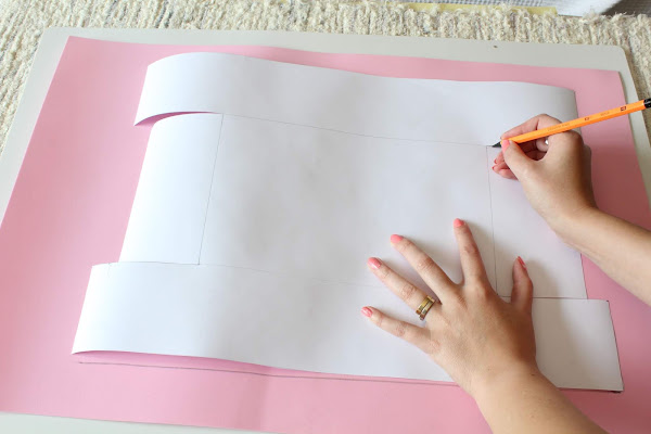 1 Paso: Haremos un plantilla (Como se ve en la imagen) de la medida de nuestra cesta en una cartulina, el patrón podéis adaptarlo a la medida que necesitéis.