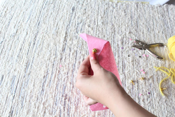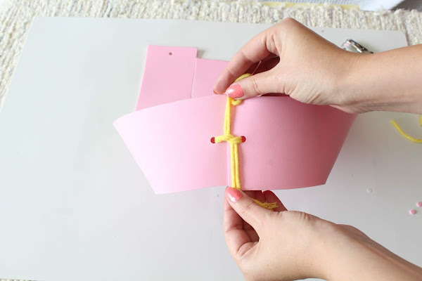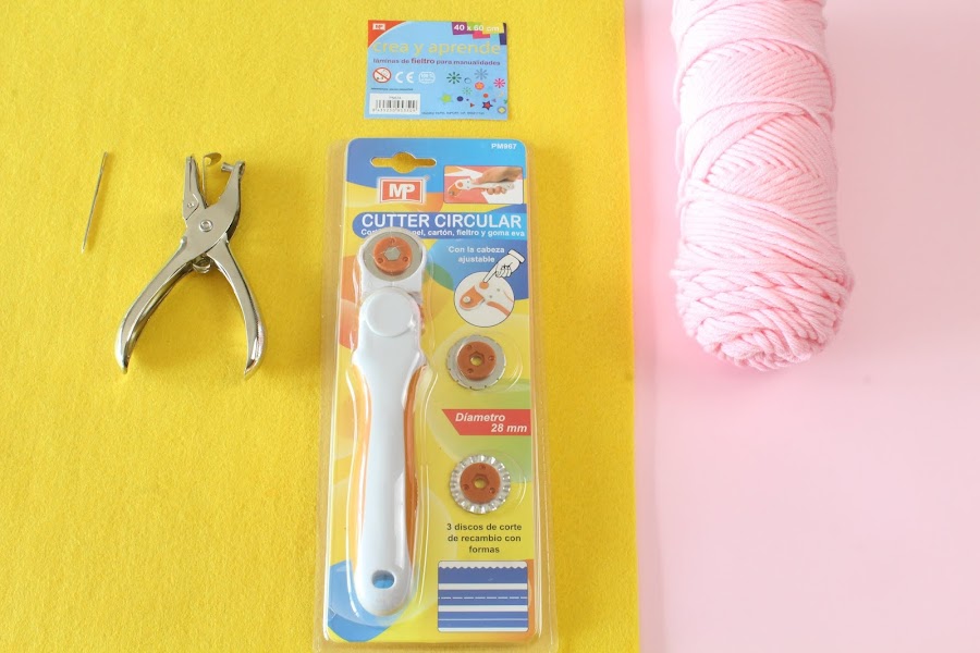 3 Paso: Uniremos los lados enfrontados y haremos un agujero con la perforadora, pasaremos un trozo de lana y haremos un Lazo.
