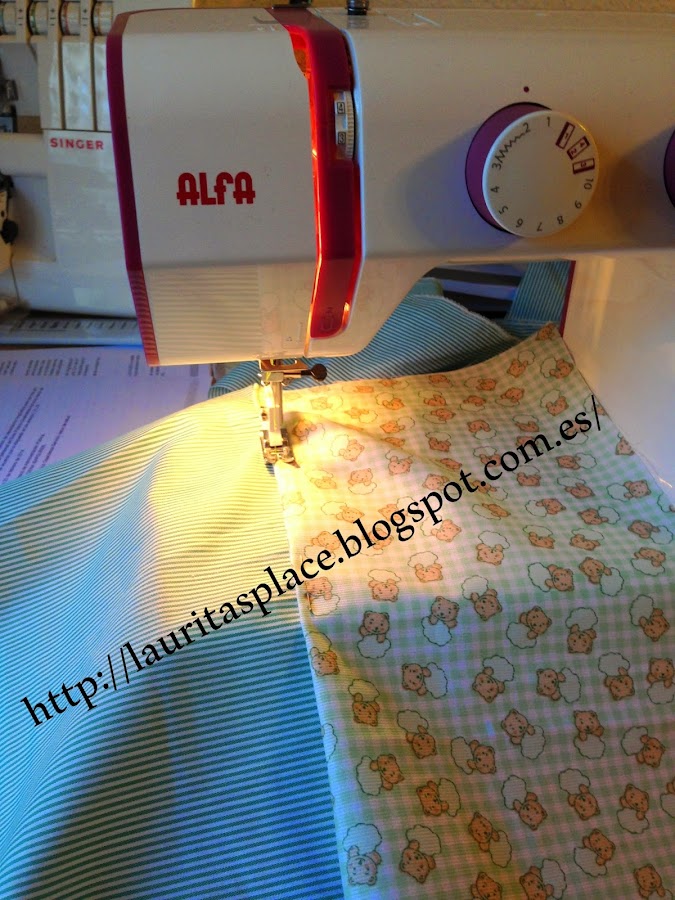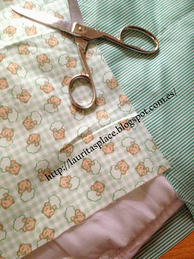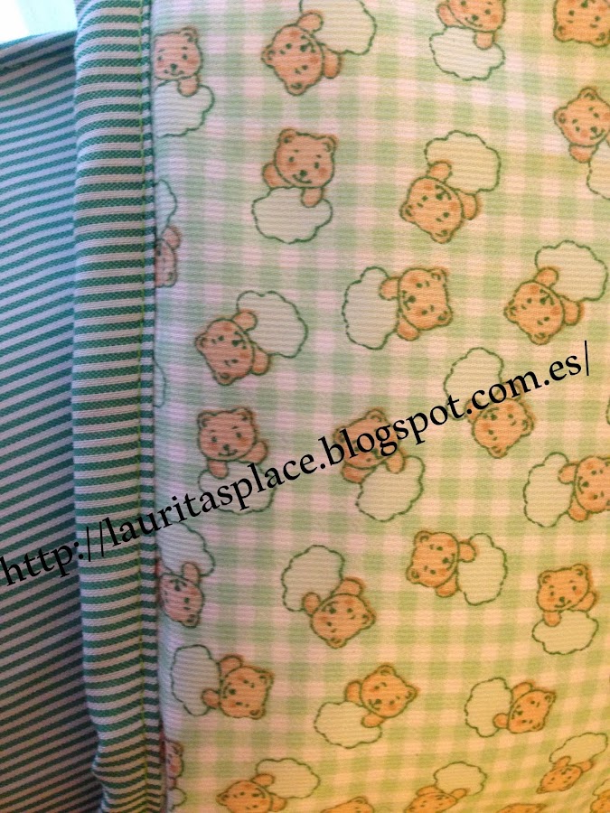 Para esta Chichonera utilicé tela de Vichy en rayas verdes y para combinar le añadí una franja en piqué de ositos en tonos verdes para dos de las partes y una entera para la del medio. Éste era un retal que había comprado en Madrid en la zona de Pontejos.