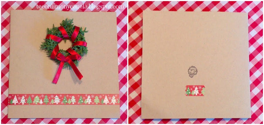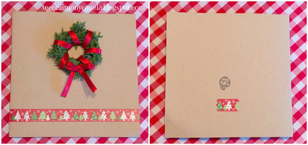 Otra Navidad hice esta tarjeta, para un swapping que organizaron las chicas de "Desafío Love Craft", con unas ramitas de tuya y cinta de raso sobre cartulina color craft. Además ese año en un mercadillo de segunda mano encontramos unos sellos de Navidad monísimos, así que lo estampé por detrás. Como remate, washi tape bordeando el pie de la tarjeta.