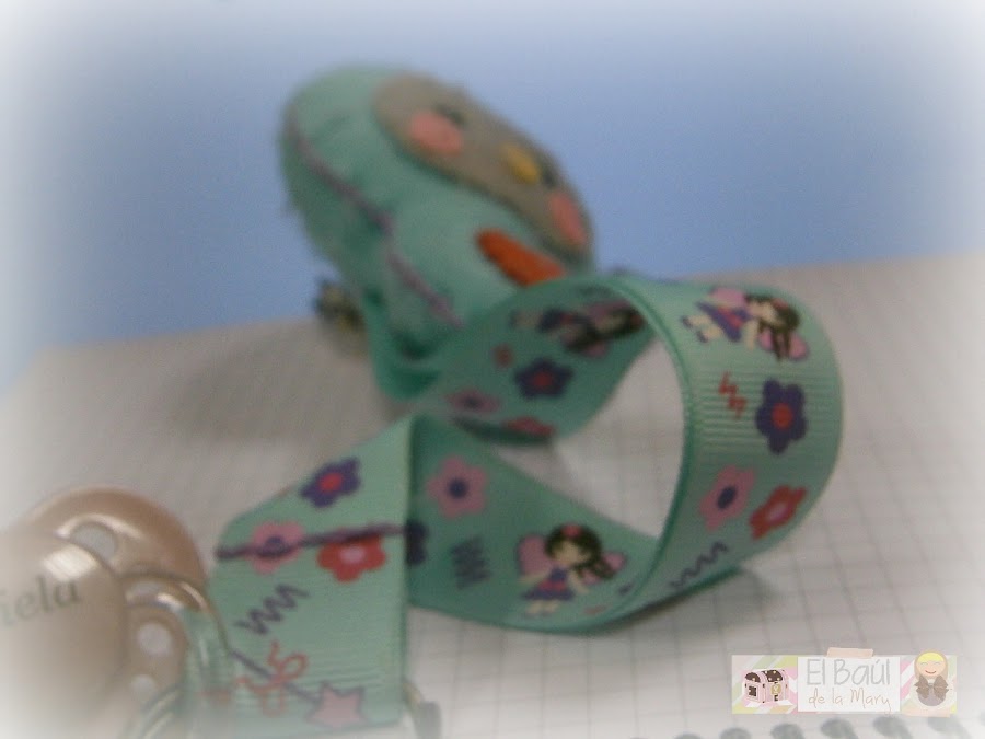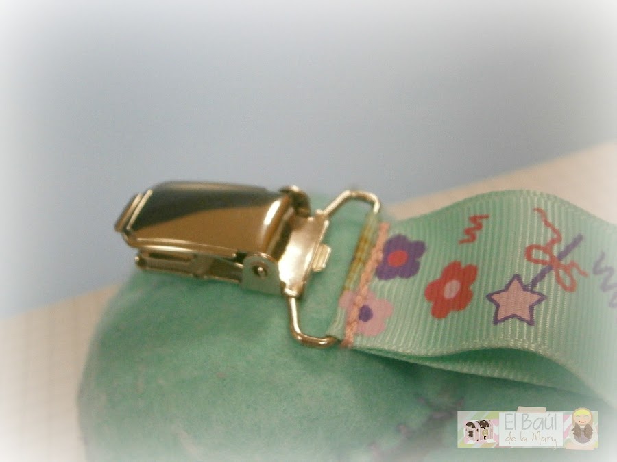 Solo tienes que añadirle una cinta bonita, una anilla para enganchar el chupete y una pinza para poder engancharlo a la ropa del bebé.
