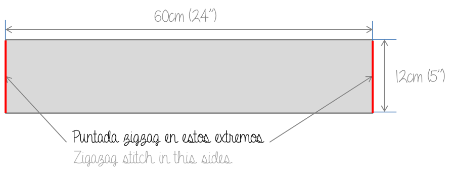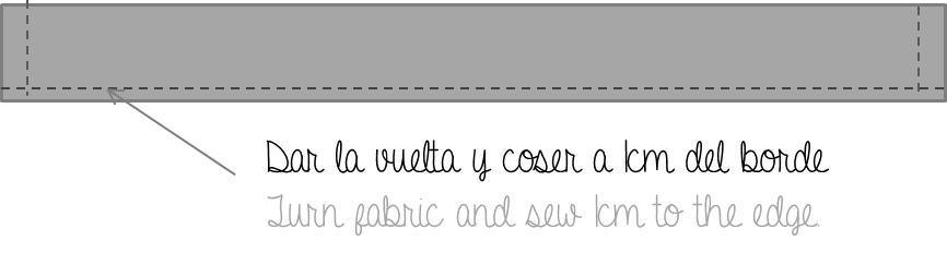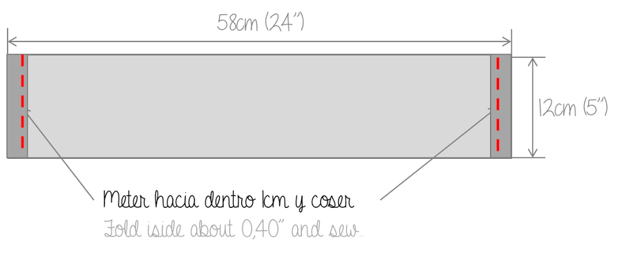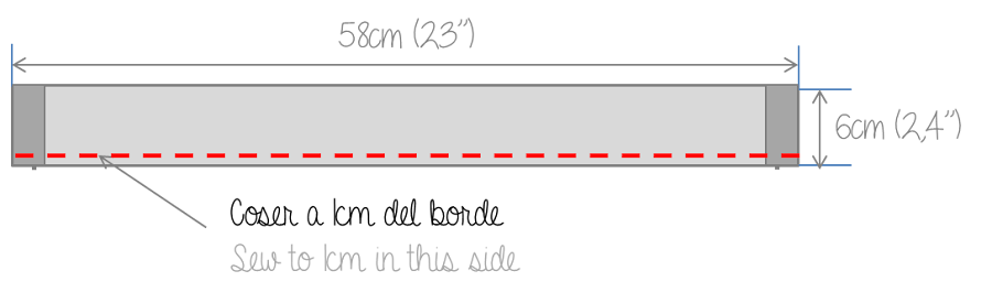 Doblar el trozo de tela por la mitad a lo largo, de modo que quede un trozo de 58x6cm y coser por el revés a 1cm del borde.