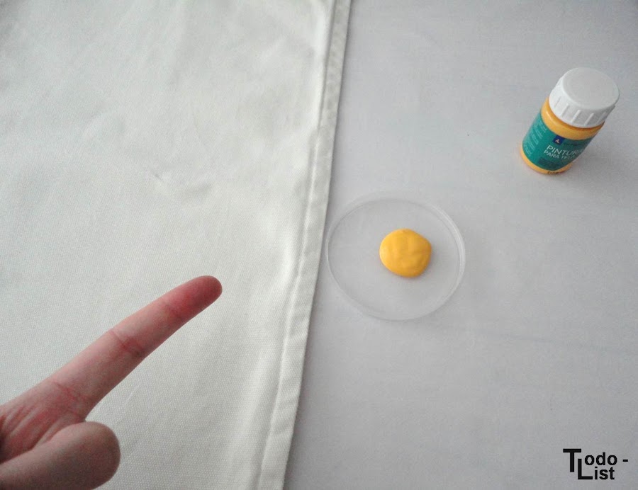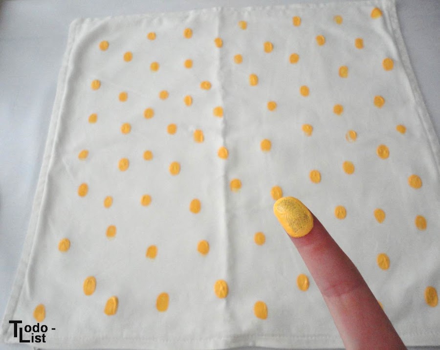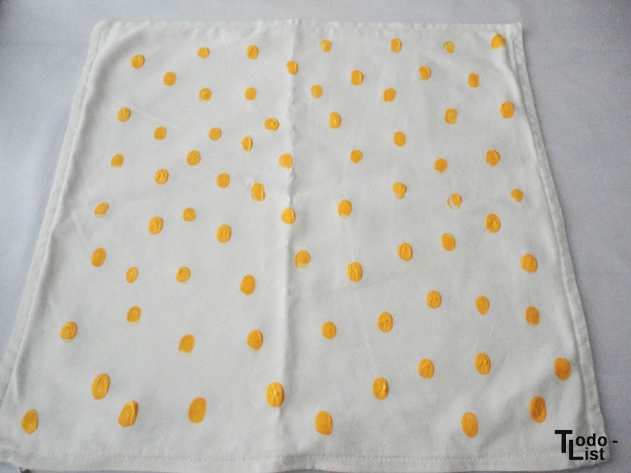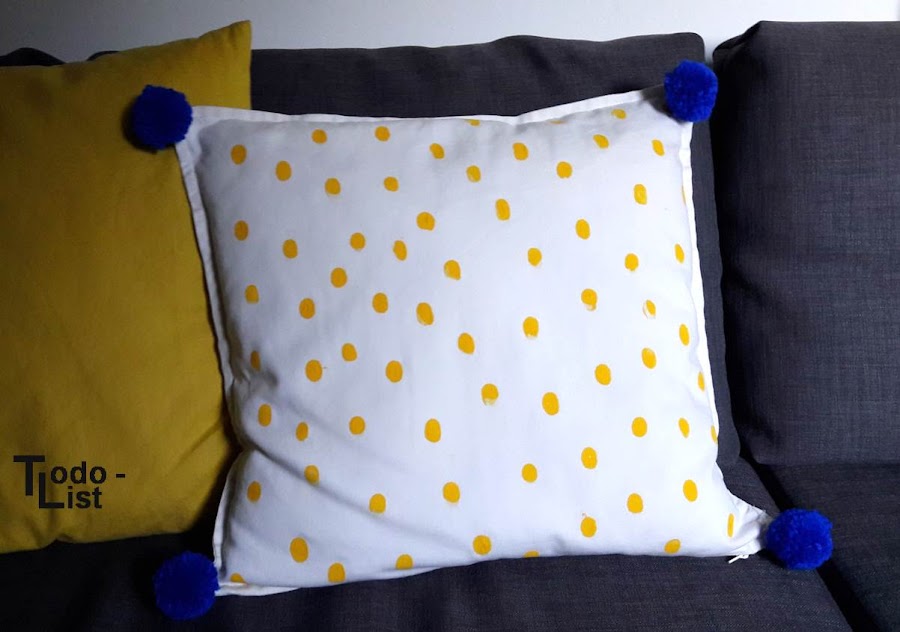 ¡No me he vuelto loca no! Para este cojín decidí no usar plantillas ni un diseño elaborado, tan solo unas risas y mi dedo para darle un toque de color con la pintura amarilla que elegí.