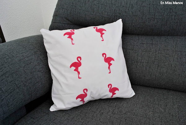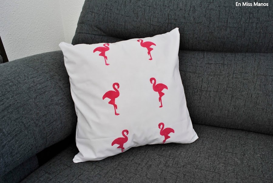 El segundo cojín lo hice estampando tela blanca. Estaba empeñada en hacerme un cojín de flamencos que tan de moda están esta temporada, y es que a mí me entró por los ojos en cuanto ví el primer producto con un flamenco, son tan, pero tan bonitos!