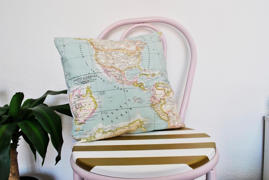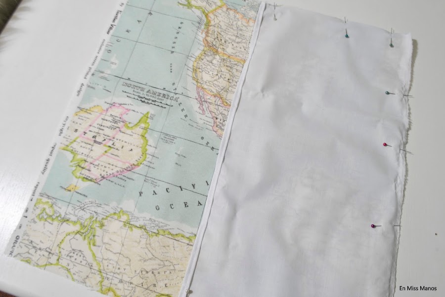 El primer cojín lo hice con la famosa tela de mapamundi que ya habréis visto tod@s en un millón de sitios y que por pena a usar, la compré hace meses y la dejé guardada. La parte trasera la hice con tela blanca que tenía en casa.